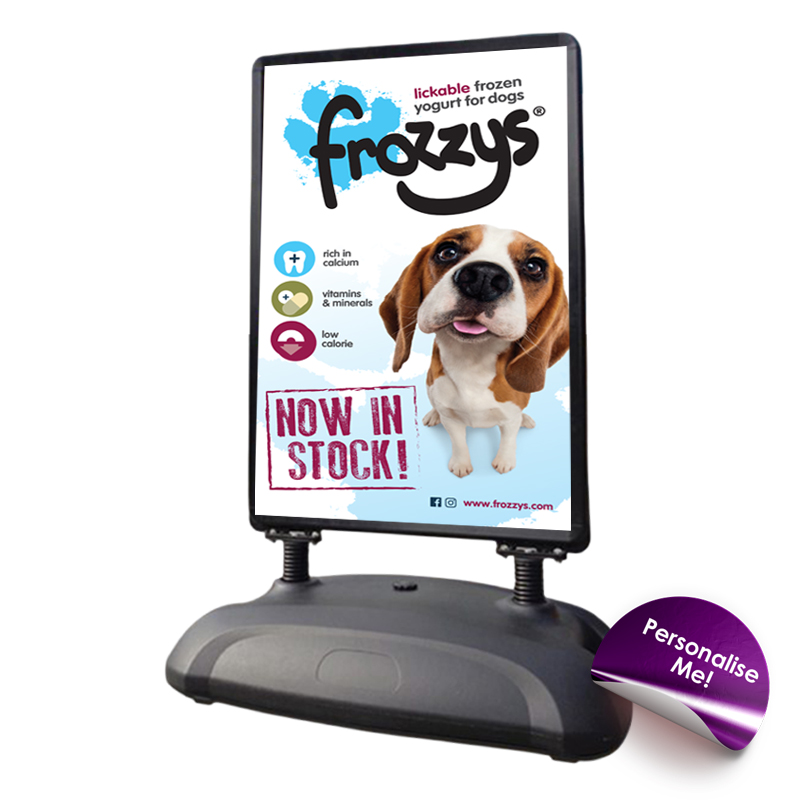 with built-in wheels. Stable with panel deflection in the wind. To Personalise this sign upload your Logo and any text content you require to be included on your pavement sign. Send artwork ready files as PDF or JPEG, 300 dpi, document size 586mm x 821mm which will be trimmed to 576mm x 821mm. If you have additional images to supply please email us the additional information to annemarie@signz.ie.